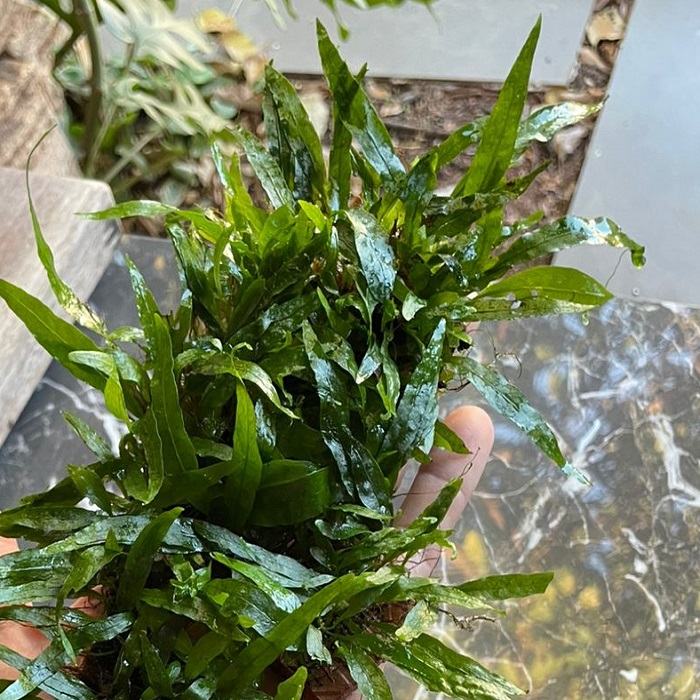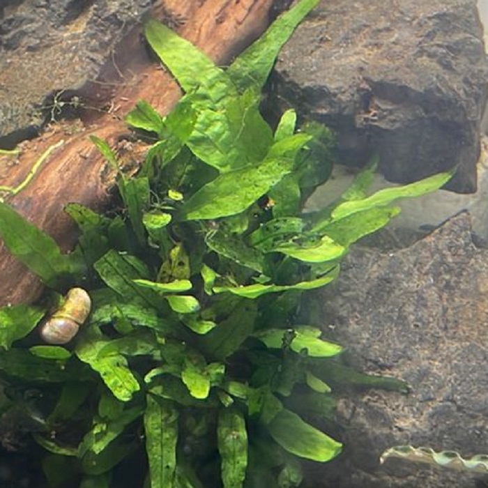 Conhwcida lá fora como a versão pequena da tradicional Microsorum pteropus. Possui folhas compactas, excelente para aquários pequenos.